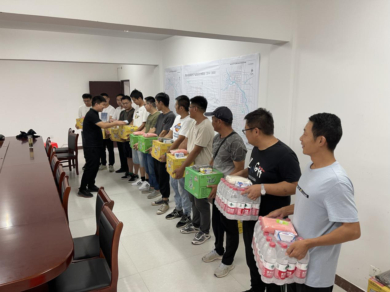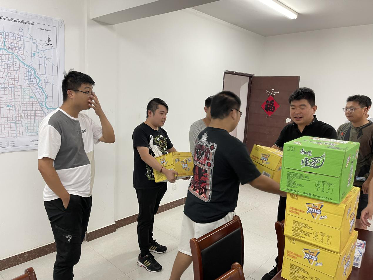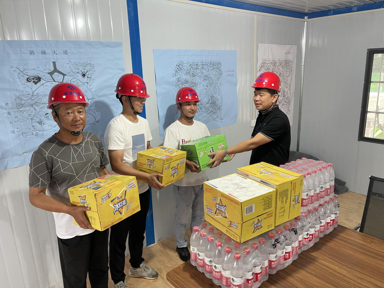 大力推進(jìn)工程進(jìn)度的同時(shí)楊總交代大家,現(xiàn)階段亳州降雨量不大,氣溫更是從五月份開始就居高不下,現(xiàn)場(chǎng)作業(yè)難度陡升,我們要克服萬(wàn)難,不怕艱辛,在不落工程進(jìn)度的同時(shí)一定也要保障施工人員的安全。除了依照上級(jí)領(lǐng)導(dǎo)要求的佩戴質(zhì)量好的安全頭盔和買好人身保險(xiǎn)以外,更應(yīng)該考慮到酷熱天氣給基層人員帶來(lái)的不便及危險(xiǎn),楊總在傳達(dá)了集團(tuán)領(lǐng)導(dǎo)的指示精神后,冒著來(lái)之不易的大雨,帶著清涼飲品先后去往養(yǎng)護(hù)、亳蕪公園以及醫(yī)療器械產(chǎn)業(yè)園等項(xiàng)目,親自為各個(gè)項(xiàng)目送去一箱箱茶水飲料,將集團(tuán)的關(guān)懷送到施工現(xiàn)場(chǎng),送到基層工作人員的身邊。