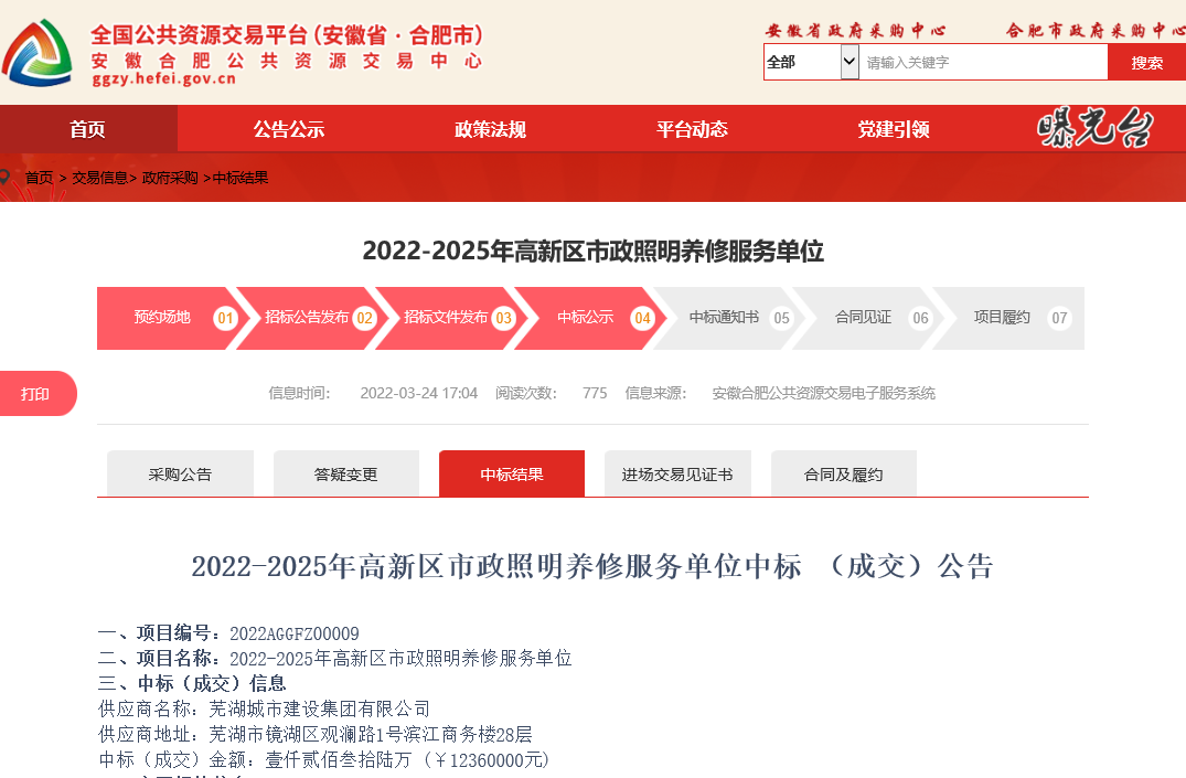2022年3月24日,集團(tuán)在合肥中標(biāo)“2022-2025年高新區(qū)市政照明養(yǎng)修服務(wù)單位”項目,中標(biāo)價為1236萬元,履約期限為3年,服務(wù)內(nèi)容主要是合肥市高新區(qū)范圍內(nèi)已移交的市政道路路燈、景觀燈、箱變(包含高壓線路)、控制箱等市政設(shè)施日常巡查、管理、養(yǎng)護(hù)、檢修等。