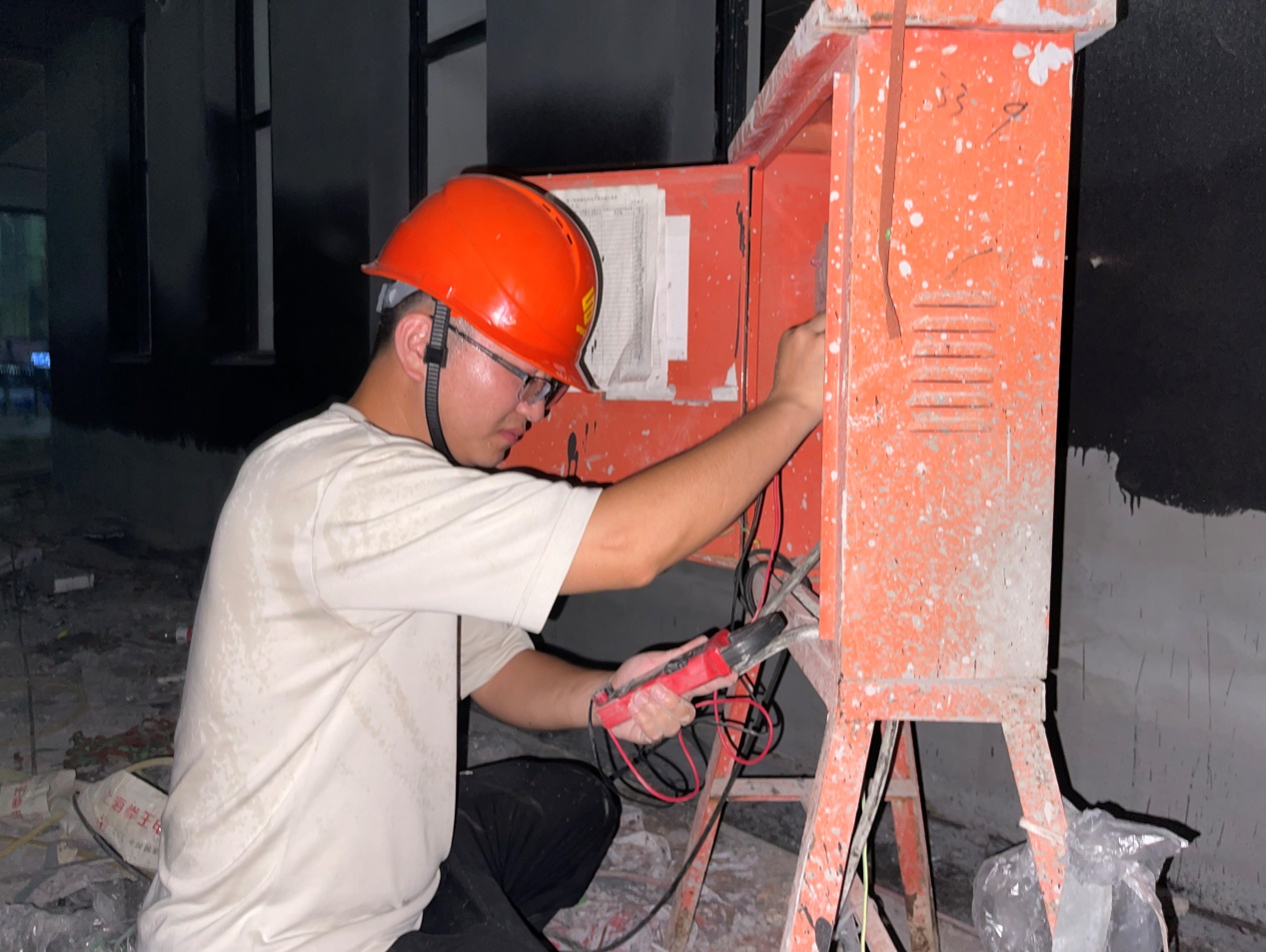 近期,通過各位同事多方協調調度,同步進場的施工隊伍增加數倍,而伴隨著工人的進場,多個工作面的展開,多臺施工機械器具也投入使用,使用電負荷激增,需求面廣,需求量大,負荷開關頻頻跳閘,導致白天機械不能連續(xù)作業(yè),夜晚照明不能滿足使用,嚴重影響施工進度。九小施工安裝負責人洪福剛加班加點,通宵達旦,配合扎實的專業(yè)知識,在保障安全的前提下,搭接多條新的用電線路、二級開關箱及照明燈具等。給機具使用和夜晚搶工作業(yè)提供了強有力的保障,極大程度的緩解了因機械設備陡增引起的用電緊張和工期延誤。